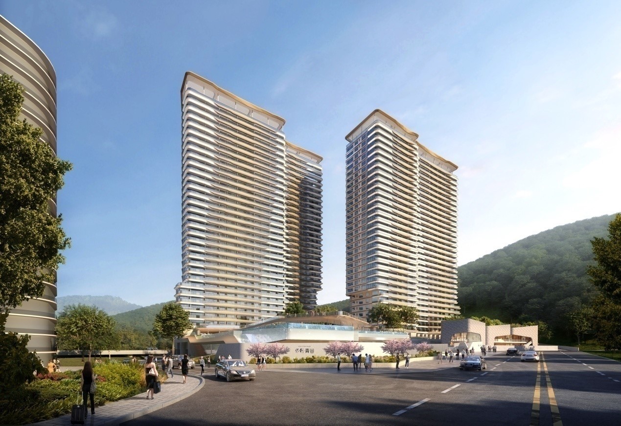 位于廣東省深圳市龍崗區(qū),設(shè)計(jì)理念源自海濱卵石和流動(dòng)的水紋,結(jié)合山海自 然美感與舒適人居,以迭砌手法創(chuàng)造建筑 形體,取之自然而禮贊自然。立面設(shè)計(jì)利 用外墻欄板作出柔和波浪,透過流線襯托 高尚不喧的建筑氣質(zhì),主體以淺色系和香 檳金相互映襯,賦予個(gè)性鮮明的外表。幕 墻面積 30000 ㎡,建筑高度 107.2m,幕墻 形式有鋁板幕墻、石材幕墻等。